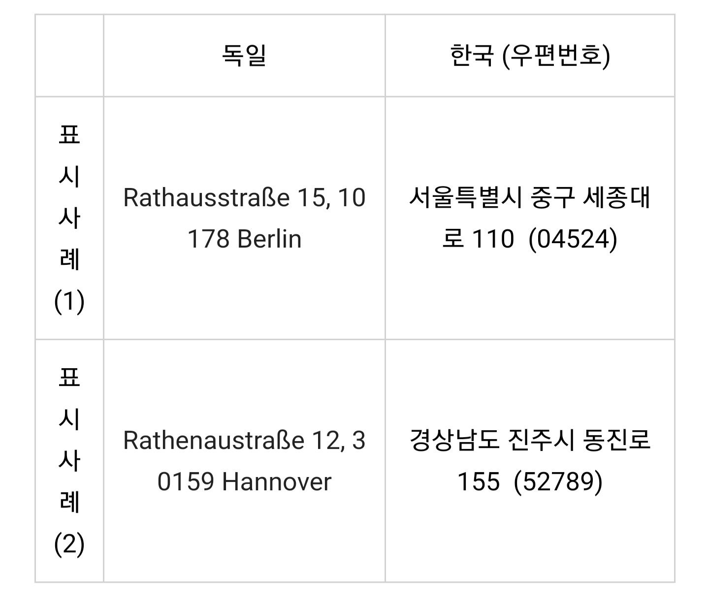 -  독일 : 거리명 + 번지, 우편번호(5자리) 도시